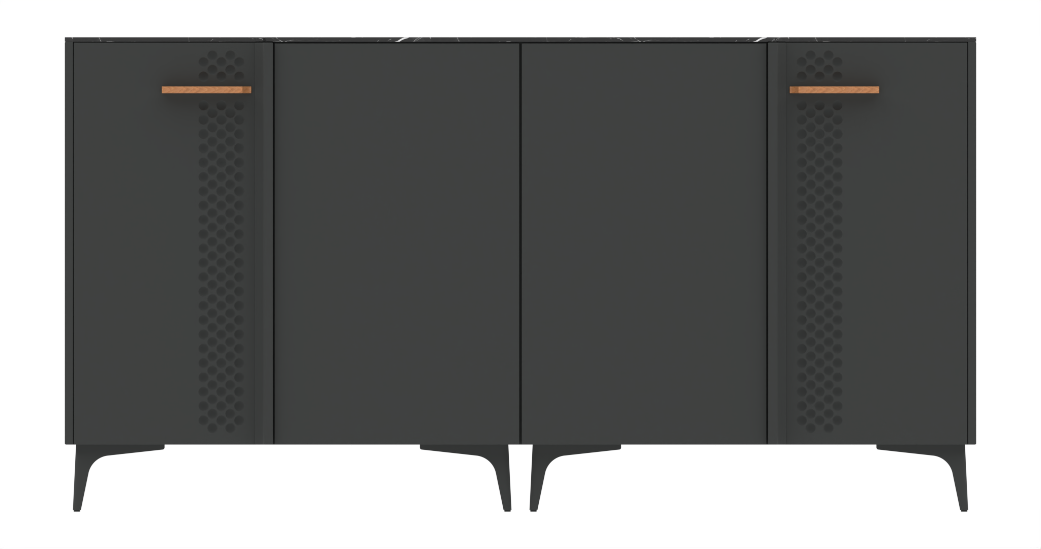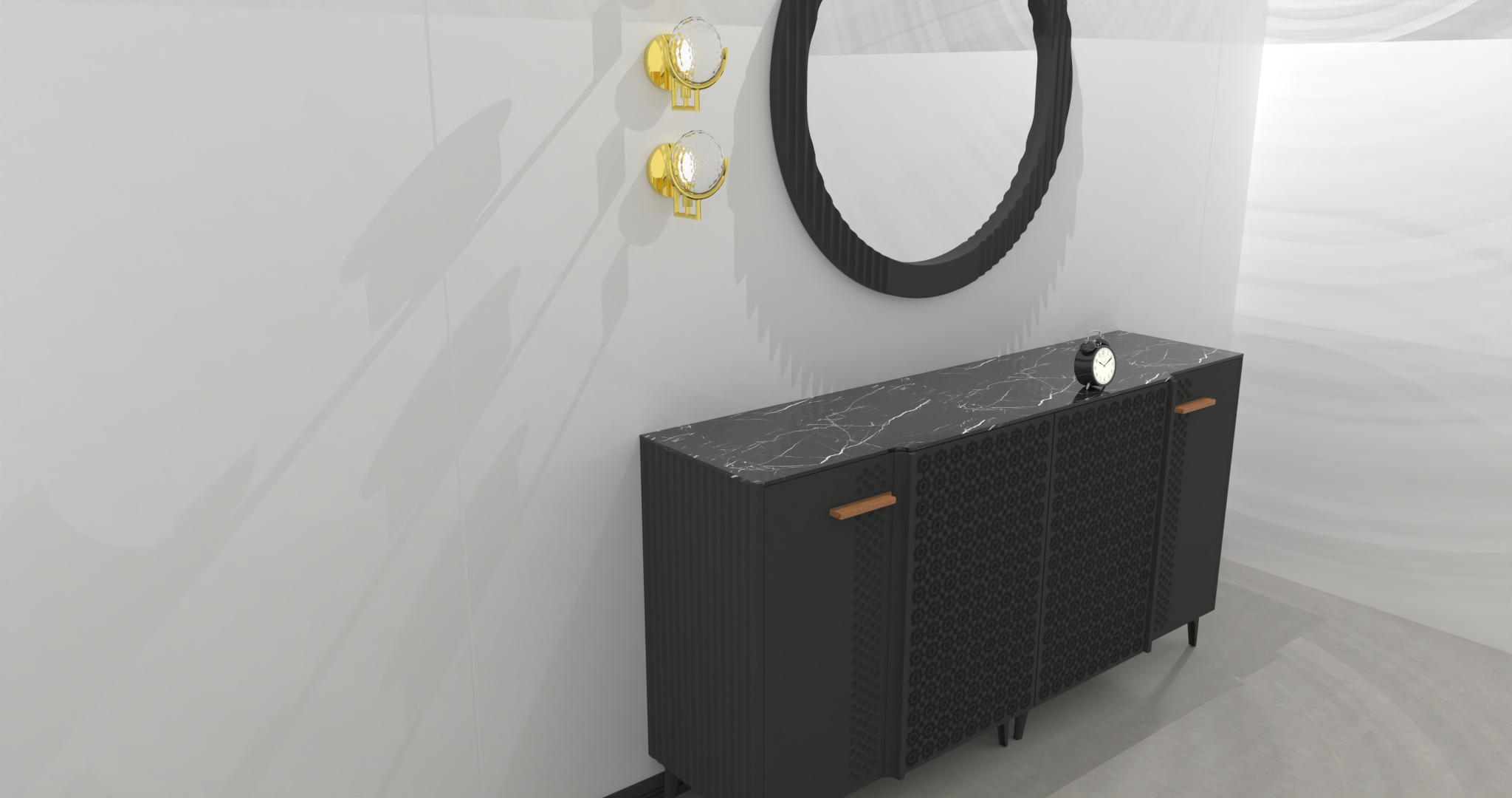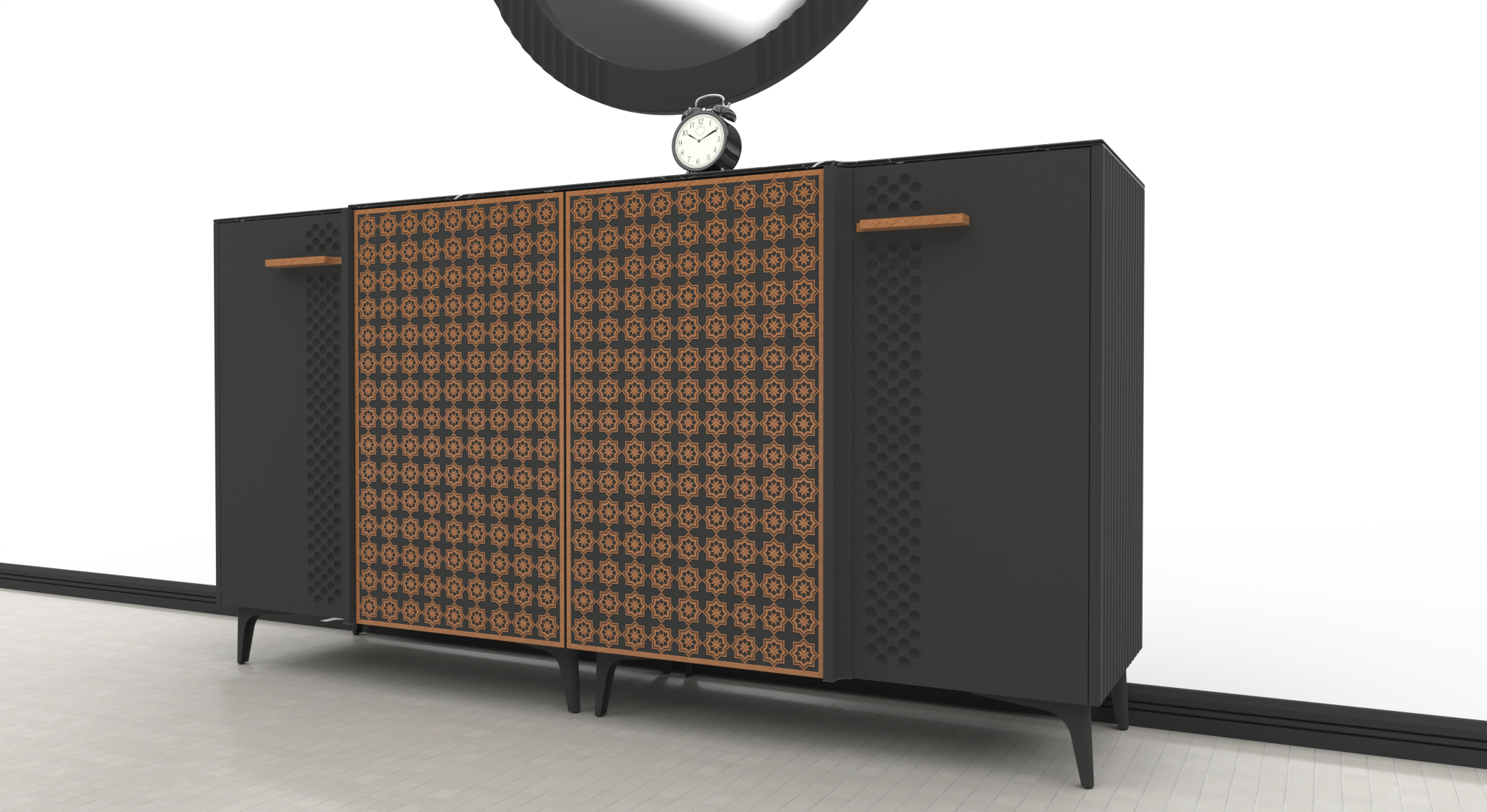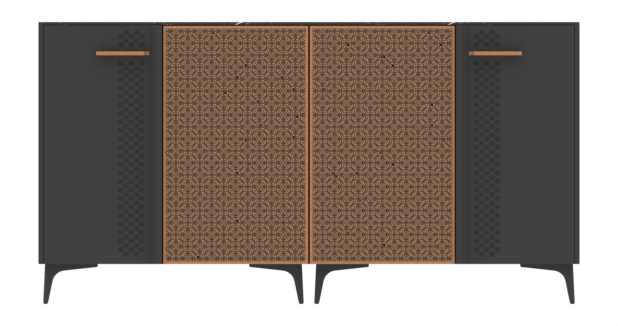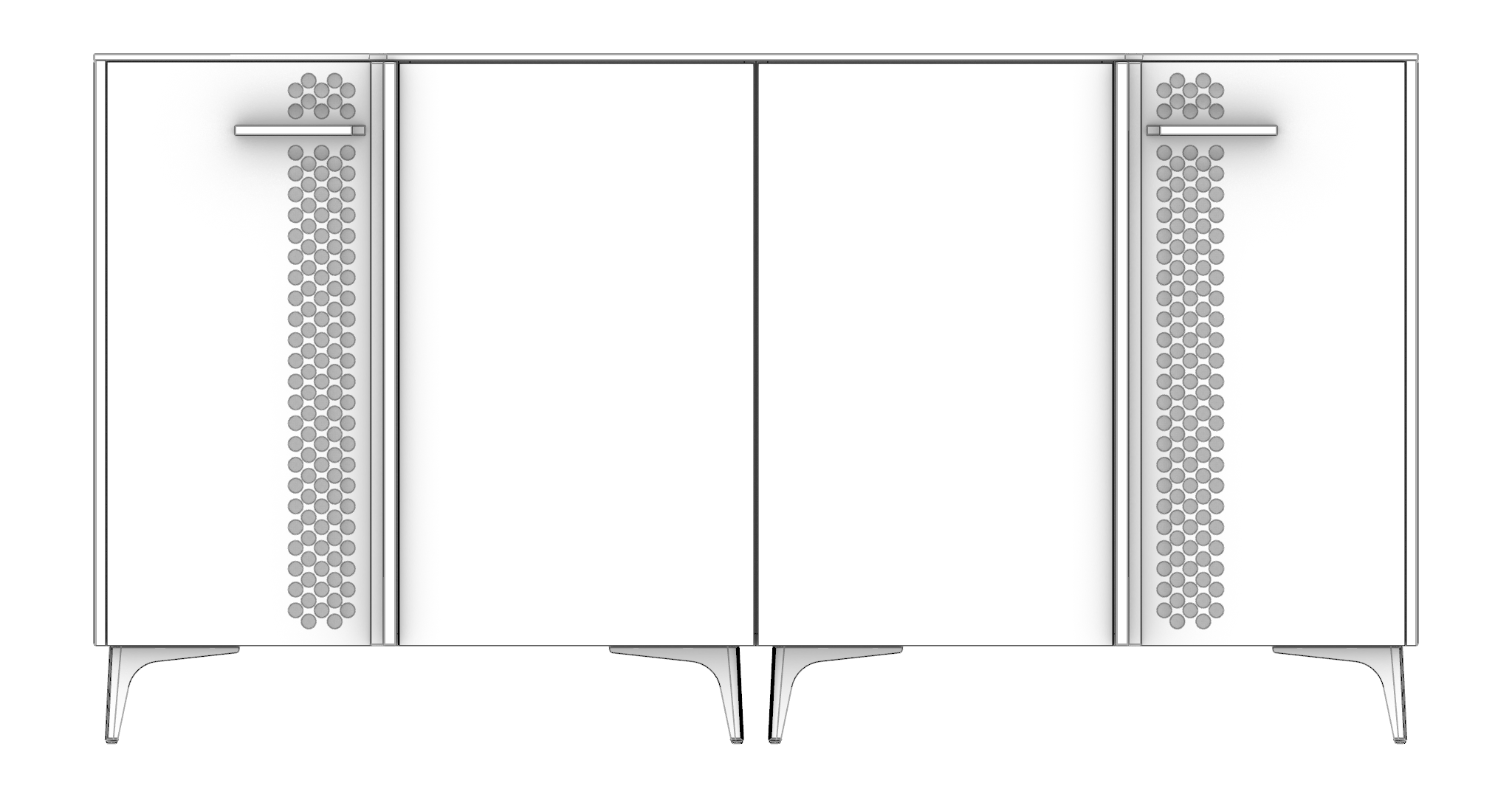 Ďalšou zvláštnosťou je vystúpenie stredových skriniek do popredia oproti bočným skrinkám. Na vnútorných krajoch bočných dvierok sú pripevnené ako keby úchytkové lišty – avšak len kvôli dizajnu, ktoré prechod s priradeným rádiusom zaujímavo dotvárajú a zjemňujú. Rádius lišty s miernym odskokom korešponduje s rádiusom vrchnej dosky.