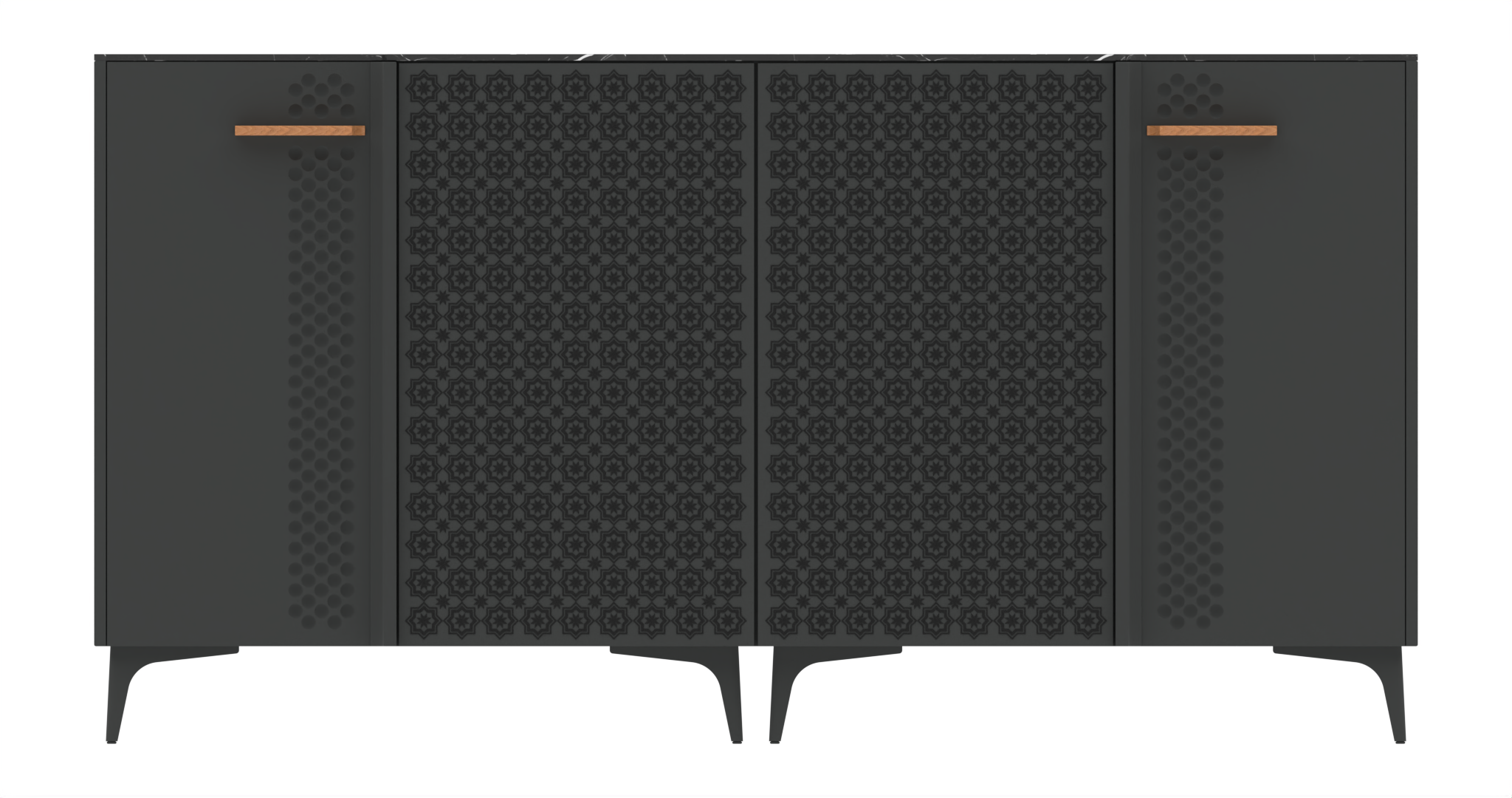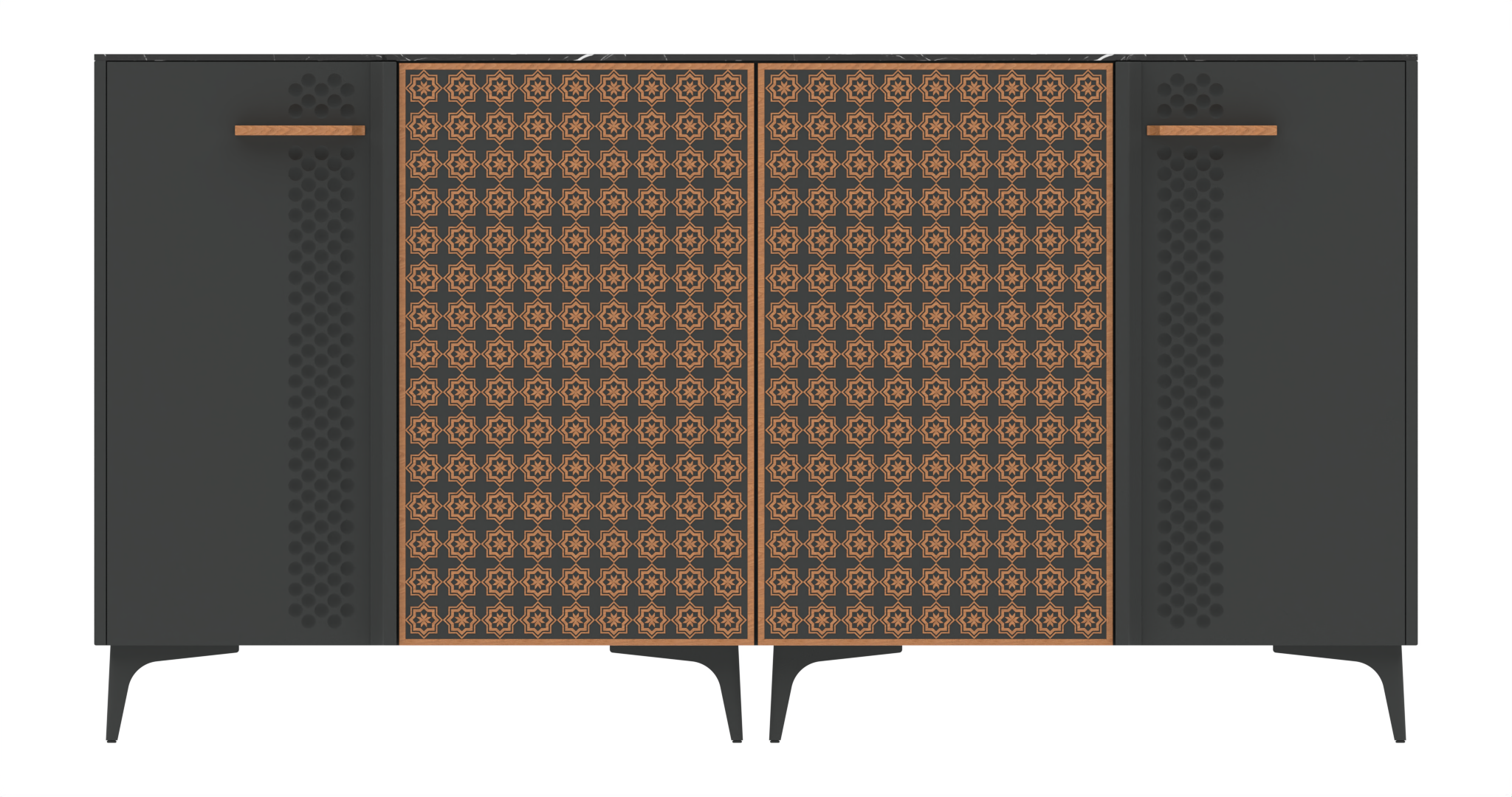 Pre túto zostavu sú charakteristické tieto znaky: Zošikmené nôžky s hranato-oblými tvarmi dostupné v čiernej, zlatej a chrómovej farbe. Bočné panely sú z nášho sortimentu striekaným dvierok LAMELA ART R32. Predné krajné dvierka sú spestrené pozdĺžnymi guľatými výfrezmi po časti ich šírky. Úchytka je z masívneho dreva alebo bude dyhovaná. Stredné susediace a bezúchytkové dvierka môžu byť hladké (náš sortiment striekaných dvierok HLADKÉ PREMIUM) podľa vami zvolenej farby. Na výber však máte aj 3 dyhované a frézované koncepty dvierok s čiernym alebo bielym vyfrézovaným podkladom. Zatváranie dvierok je zabezpečené závesmi BLUM s doťahom a dobrzdením. Štýlová pracovná doska je z umelého kameňa GRANDEX s hrúbkou 10mm. Kvôli excelentným vlastnostiam ako sú tvrdosť, vodeodolnosť, UV stálosť a pod. sa používa hlavne na drahšie kuchynské linky a kúpľne. Máte však možnosť zvoliť si aj iný materiál.